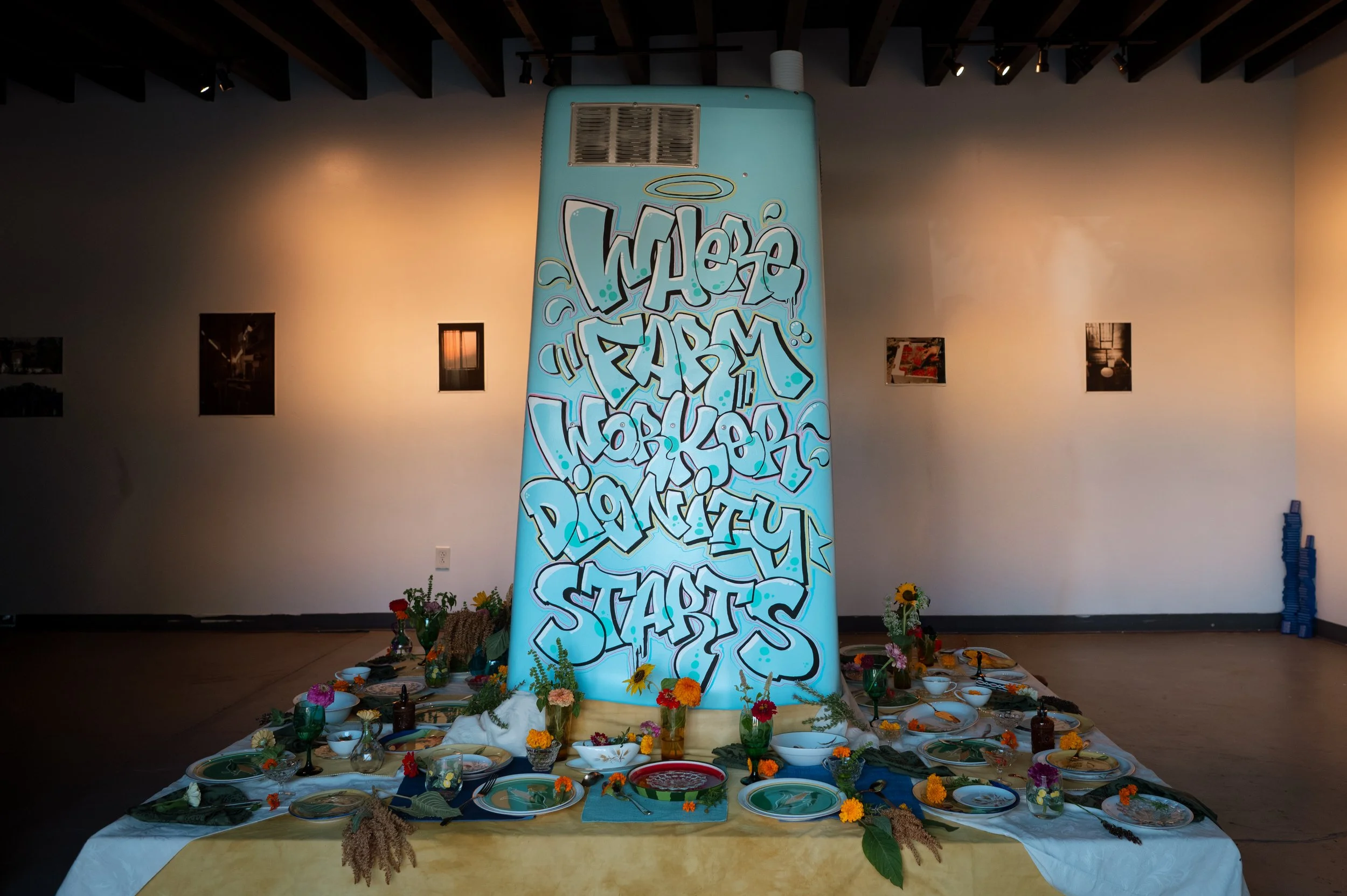 Court Kessler, a photographer and farmworker, came out and took photos of the opening event. We had the opening catered by technobutter and the Bathrooms & Dignity books were available to purchase at sliding scale. Dr. Bronners came through with a donation of 400 bars of soap to support the installation and to give out to attendees. We donated all the leftover soap post show to Albuquerque Mutual Aid to distribute among unsheltered neighbors.