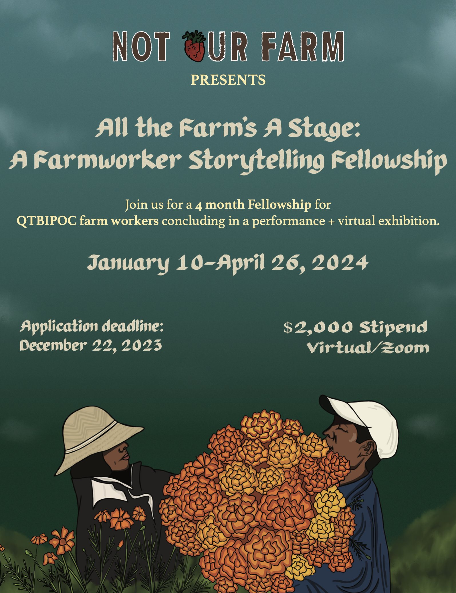 All the Farm’s a Stage is a 6 month storytelling fellowship for QTBIPOC farmworkers culminating in a virtual performance + virtual multimedia exhibit. This fellowship also aims to build relationships among the cohort of farmworkers and their communities.