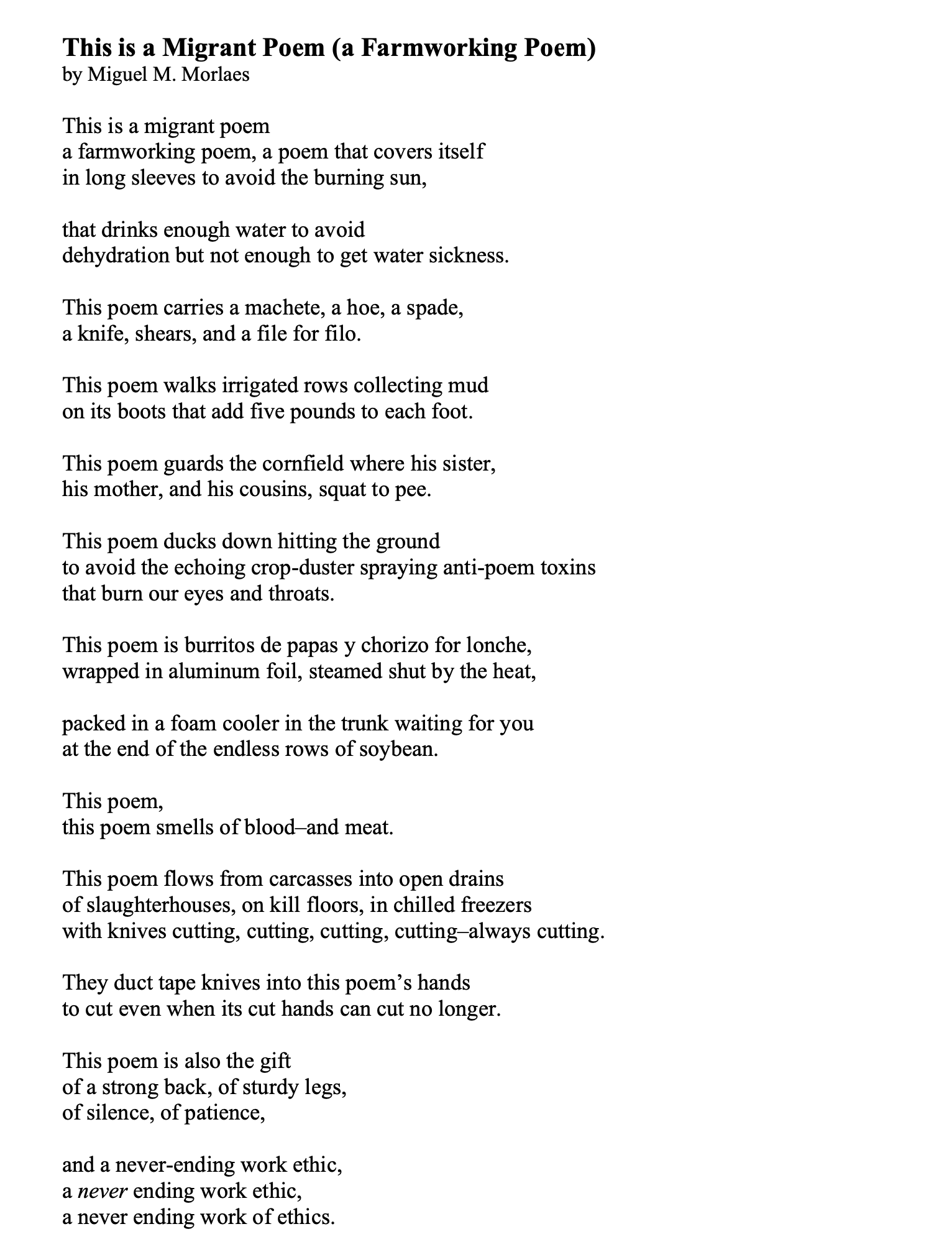 Miguel M. Morales grew up in Texas working as a migrant and seasonal farmworker. Selected as a finalist for the 2023-2026 Poet Laureate of Kansas, he is a two-time Lambda Literary Fellow and an alum of VONA/Voices and of the Macondo Writers Workshops.
